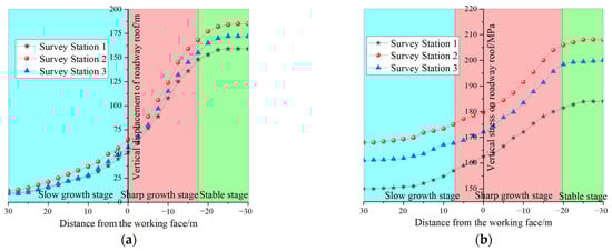 The roof deformation of the 9306 working face at different burial depths is shown in Figure 12a. The analysis reveals that as the working face advances, the vertical displacement of the roof exhibits a gradual increase, followed by a sharp increase, and finally stabilizes. The peak vertical displacements of the three monitored sections are all located on the roof-cutting side and gradually increase with increasing burial depth, with values of 159 mm, 172 mm, and 185 mm, respectively. These values are similar to the numerical simulation results of 182 mm, 185 mm, and 194 mm, with an error rate maintained between 5% and 14%. Notably, when compared to the designed height of the roadway of 2.2 m, the maximum roof deformation accounts for approximately 8.4%, indicating that the deformation of the roof at different burial depths has been effectively controlled through reasonable roof-cutting parameters.