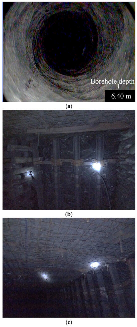 The effect of entry retention in the air intake roadway of the 9306 working face in Anshun Coal Mine: (a) borehole inspection of the GSER roof; (b) effectiveness of roadside support in GSER; (c) and overall stability of the surrounding rock in GSER.