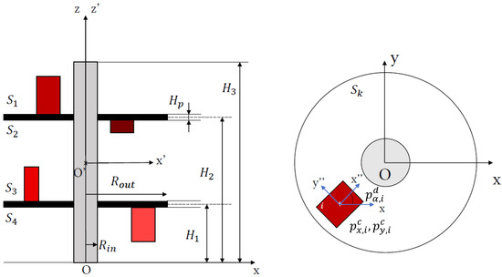 - Overlapping constraints between components: No overlapping between components is allowed on each surface. As in [19,20,108], the plates are supposed to be sufficiently spaced to avoid any overlapping between components positioned on the surfaces and . The overlapping constraint between components is formulated as follows:where is the number of surfaces, is the number of components on surface k and corresponds to the 2-dimensional projections (along the z axis) of components i and j on the surface k and is a function of the centers of inertia and orientations of the components.