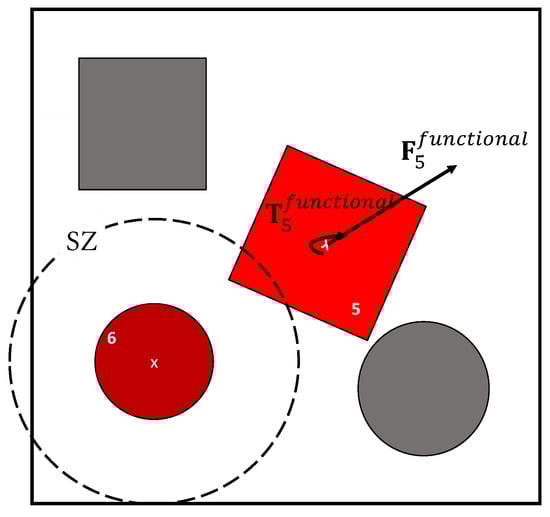 - The functional constraint force and torque between two components: If a component i is too close to an incompatible component j, a repulsive force is applied to the component i, as illustrated in Figure 6. The functional force acts as an overlapping force between the component i and the influence zone of the component j. Then, the functional force is expressed aswhere is the intersection area between component i and the functional security zone surrounding component j.The related torque is calculated as follows:where is the center of inertia of component i and is the geometrical center of the area of component i overlapping the functional security zone surrounding component j.