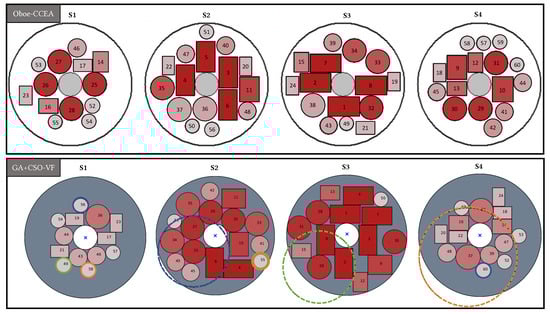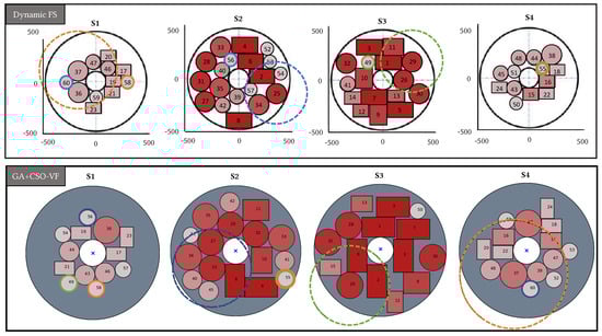 - The layout: As highlighted in [124], the CSO-VF outperforms the population-based counterparts like GAs thanks to its ability to solve the constraints with dedicated operators. Indeed, Figure 14 shows that the CSO-VF algorithm systematically positions the heavier components closer to the center of the surfaces, which contributes to minimize the global inertia of each container. On the contrary, it is observed that the Dynamic FS algorithm sometimes positions small and light components around the central bus.