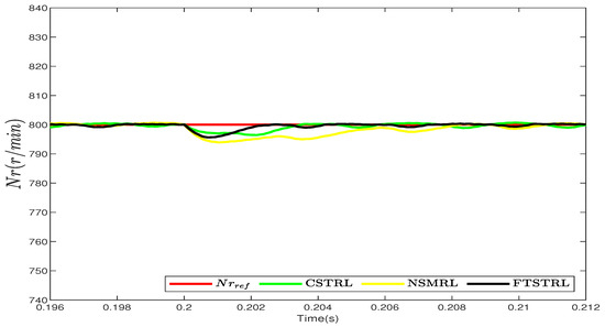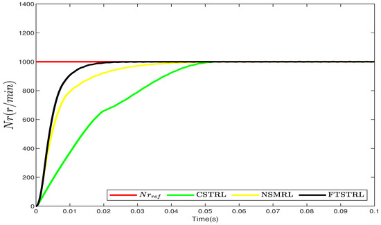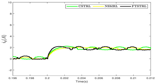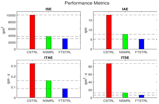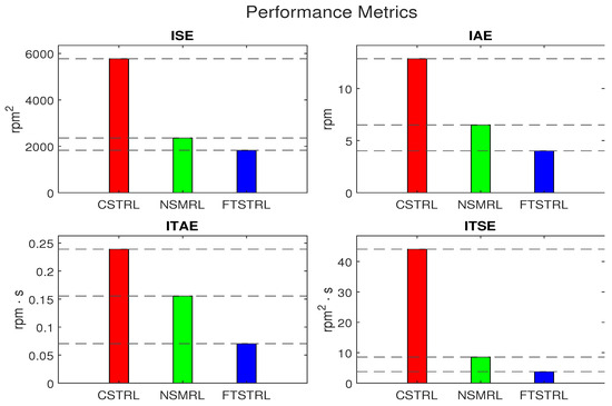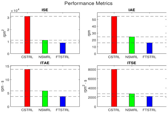 Figure 5 illustrates the speed tracking performance of the CSTRL, NSMRL, and FTSTRL. The desired speed undergoes several changes: from 0 to 200 rpm at 0.01 s, from 200 to 900 rpm at 0.11 s, from 1000 to −200 rpm at 0.22 s, and from −200 to 800 rpm at 0.42 s. The results clearly show that the FTSTRL achieves superior tracking performance compared to the CSTRL and NSMRL. Figure 6 depicts the corresponding current variations, which reflect the control input. Additionally, Figure 7 presents a detailed comparative and quantitative analysis of the simulation results for speed tracking, utilizing the metrics of ISE, ITSE, IAE, and ITAE.