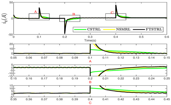 This section showcases the simulation results that validate the effectiveness of the proposed control strategy. Detailed simulation parameters for the model, observer, and controllers are provided in Table 1, Table 2 and Table 3, respectively. The parameters in Table 2 and Table 3 were obtained through multiple rounds of tuning and experience. These tables list the specific values and configurations employed in the simulations, ensuring that the results are clear and reproducible. The letter A, B, C represent the enlarged part and correspond to the corresponding figures. Figure 2 illustrates a comparison of the time taken by the CSTRL, NSMRL, and FTSTRL systems to achieve speed regulation at a target of 1000 rpm. This comparison highlights the relative performance and efficiency of each control strategy. As shown, the FTSTRL reached the desired speed of 1000 rpm in just 0.02 s, whereas the CSTRL and NSMRL took 0.05 and 0.048 s, respectively. This indicates that the FTSTRL outperformed both the CSTRL and NSMRL. Figure 3 illustrates the corresponding variations in current, reflecting the changes in control inputs. Moreover, Figure 4 presents an in-depth comparative and quantitative analysis of the speed regulation simulation results. This analysis employs key performance metrics such as ISE, ITSE, IAE, and ITAE. By leveraging these metrics, we can rigorously evaluate each control strategy’s performance, focusing on its precision, response time, and overall effectiveness.