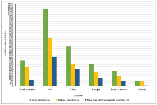 Based on the methodological framework and study design above, the results were divided into two main sections, each with two subsections: (a) geographical distribution of natural and man-made (technological) disasters (in-depth analysis of disaster distribution by continent and country with comprehensive supporting data); and (b) temporal distribution of natural and man-made (technological) disasters (yearly and monthly trends in occurrences and consequences of natural and man-made (technological) disasters).