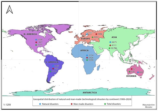 Geospatial distribution of natural and man-made (technological) disasters by continent (1900–2024).