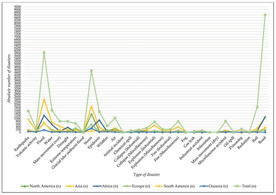 In contrast, man-made (technological) disasters were most prevalent in Africa, accounting for 43.79% of all disasters on the continent. Asia followed with 38.11%, while Europe and South America reported 35.46% and 33.44%, respectively. Oceania had the lowest percentage of man-made (technological) disasters at just 8.49%. From the comprehensive data, it is evident that natural disasters dominate most continents, particularly in Oceania and North America. Despite Asia having the highest total number of disasters, it also had a significant proportion of man-made (technological) disasters (38.11%), highlighting the presence of technological accidents in the region. Africa’s notable percentage of man-made (technological) disasters (43.79%) may reflect various socio-economic factors and levels of infrastructural development (Table 1 and Figure 2).