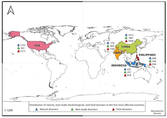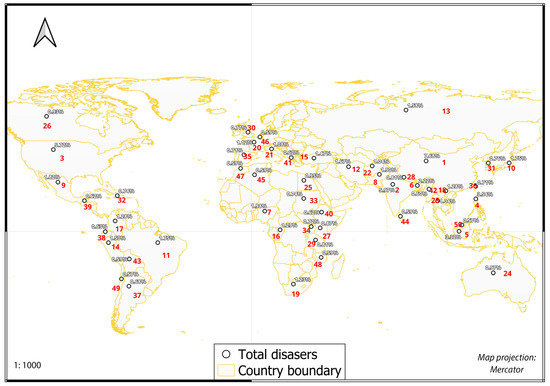 The geospatial and temporal distribution patterns of various disasters have been analyzed in multiple studies [,]. Over the past century, natural disasters like droughts, floods, and storms have generally become more frequent and severe, with a marked increase in intensity observed in recent decades [,,]. Shen and Hwang [] conducted a geospatial analysis of 9962 natural disasters occurring worldwide between 1960 and 2018, covering 39,953 locations. They found that Asia, particularly the southeastern region, was the most disaster-affected area, with countries like China, India, the Philippines, and Indonesia being heavily impacted. Also, this analysis highlighted a strong correlation between a region’s geographical location, its size, its population, and its susceptibility to specific natural disasters. For example, seismic activity was more prevalent in Asia, while storms were more common in the United States due to its diverse climate. Also, Nones et al. [] uncovered rising trends over time in both droughts and wildfires, with their spatial distribution increasingly shaped by the effects of climate change and human activities. The study’s findings highlight how the economic damages from these disasters play a significant role in hindering the recovery process for the communities impacted. Furthermore, according to the 2023 annual report from the EM-DAT database [], a total of 399 disasters were recorded, leading to 86,473 fatalities and impacting 93.1 million people globally. Among the most catastrophic events were the earthquake in Turkey and Syria and the severe drought in Indonesia, both of which had profound effects on human lives and the economies of the affected regions.