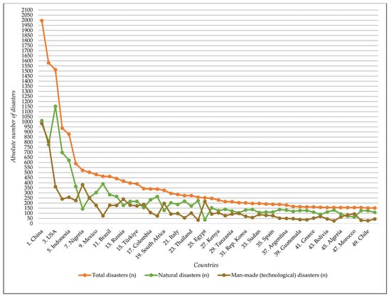 The data for this study were sourced from the international EM-DAT (Emergency Events Database). EM-DAT is a comprehensive global database that tracks and records all types of natural and human-induced (technological) disasters. It is maintained and regularly updated by the Centre for Research on the Epidemiology of Disasters (CRED) at the University of Louvain, Belgium. A diverse range of sources, including UN agencies, non-governmental organizations, reinsurance firms, research institutions, and media outlets, were used to assemble the database []. The dataset can be accessed directly through their website (https://www.emdat.be/, accessed on 15 June 2024).