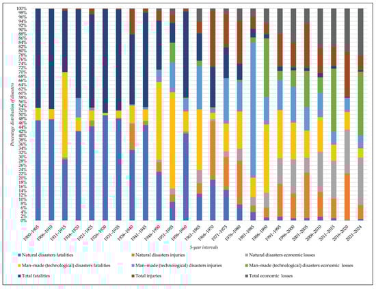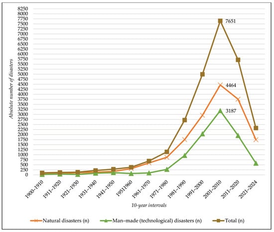 Regarding this, the aim of this study is to provide a scientific description and comprehensive understanding of the patterns and impacts of natural and man-made (technological) disasters over more than a century. By analyzing the geospatial and temporal distribution of these events, this study aims to offer valuable insights that can inform future disaster risk management strategies, enhance preparedness, and ultimately contribute to reducing disaster-related losses. This research highlights the urgent need for tailored disaster risk management strategies that address the distinct challenges and impacts in various regions, thereby promoting resilience and sustainable development. A comprehensive understanding of the specific challenges and impacts encountered by different regions is crucial for developing strategies that not only bolster the resilience of these communities to future disasters but also align with broader sustainable development objectives. For example, addressing vulnerabilities related to infrastructure and socio-economic factors can foster more resilient systems that contribute to long-term sustainability and effectively reduce the risk of future disasters.