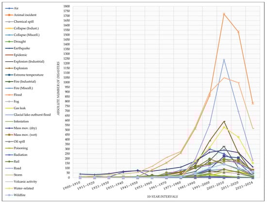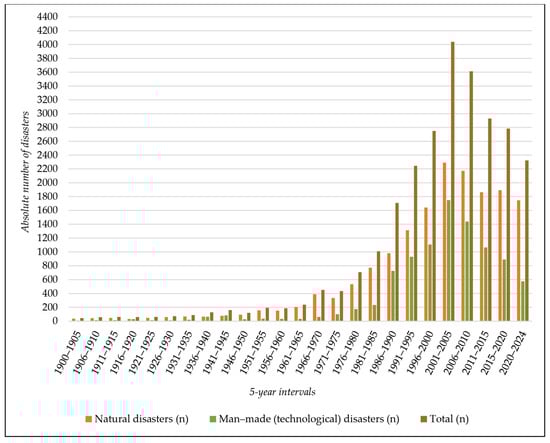 For this study, a total of 25,836 disasters from 1900 to 2024 were analyzed. The data were cleaned and prepared for analysis using the Statistical Package for the Social Sciences (IBM SPSS Statistics, Version 26, New York, NY, USA) software after being downloaded. The data preparation process included several key steps: (a) identifying and removing duplicates and missing values to ensure data accuracy and consistency; (b) converting all data into a uniform format to facilitate easier analysis and interpretation, classifying disasters by type, intensity, geographical area, and period. During the data processing phase, all numerical values were standardized to ensure consistent interpretation of results across different time periods and geographic regions. Additionally, categorical data were coded to facilitate their integration into regression models and other quantitative analyses.