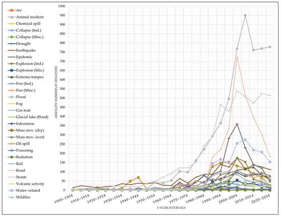 Environmental events like earthquakes, floods, hurricanes, and wildfires are driven by natural and climatic forces [,,,,,,,]. The patterns of these disasters, including their frequency, intensity, and locations, have evolved over time due to shifts in climate, land usage, and population growth [,,,,,]. Also, trends can be uncovered and high-risk areas identified through the analysis of past data, thus improving the ability to forecast and respond to future events []. In contrast, man-made (technological) disasters arise from human activities such as industrial mishaps, nuclear accidents, and oil spills. These incidents often occur due to equipment failures, human and organizational mistakes [], or weak regulatory measures. Failures can occur during the design, construction, operation or maintenance phases [,]. Insights into industrial operations and regulatory practices can be gained by examining when and where these disasters happen, leading to improved safety protocols and emergency response strategies [].