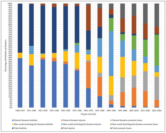 This pioneering study explores the geospatial and temporal patterns of natural and human-induced disasters from 1900 to 2024, providing essential insights into their global distribution and impacts. Significant trends and disparities in disaster occurrences and their widespread consequences are revealed through the utilization of the comprehensive international EM-DAT database. The results showed a dramatic escalation in both natural and man-made (technological) disasters over the decades, with notable surges in the 1991–2000 and 2001–2010 periods. A total of 25,836 disasters were recorded worldwide, of which 69.41% were natural disasters (16,567) and 30.59% were man-made (technological) disasters (9269). The most significant increase in natural disasters occurred from 1961–1970, while man-made (technological) disasters surged substantially from 1981–1990. Seasonal trends reveal that floods peak in January and July, while storms are most frequent in June and October. Droughts and floods are the most devastating in terms of human lives, while storms and earthquakes cause the highest economic losses. The most substantial economic losses were reported during the 2001–2010 period, driven by catastrophic natural disasters in Asia and North America. Also, Asia was highlighted by our research as the most disaster-prone continent, accounting for 41.75% of global events, with 61.89% of these events being natural disasters. Oceania, despite experiencing fewer total disasters, shows a remarkable 91.51% of these as natural disasters. Africa is notable for its high incidence of man-made (technological) disasters, which constitute 43.79% of the continent’s disaster events. Europe, representing 11.96% of total disasters, exhibits a balanced distribution but tends towards natural disasters at 64.54%. Examining specific countries, China, India, and the United States emerged as the countries most frequently affected by both types of disasters. The impact of these disasters has been immense, with economic losses reaching their highest during the decade of 2010–2020, largely due to natural disasters. The human toll has been equally significant, with Asia recording the most fatalities and Africa the most injuries. Pearson’s correlation analysis identified statistically significant links between socioeconomic factors and the effects of disasters. It shows that nations with higher GDP per capita and better governance quality tend to experience fewer disasters and less severe negative consequences. These insights highlight the urgent need for tailored disaster risk management strategies that address the distinct challenges and impacts in various regions. By understanding historical disaster patterns, policymakers and stakeholders can better anticipate and manage future risks, ultimately safeguarding lives and economies.