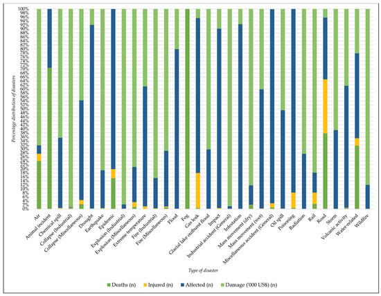 The database contains information on disasters that have occurred worldwide since 1900 and meet at least one of the following criteria: 10 fatalities, 100 people affected, declaration of a state of emergency, and an international request for assistance. Each entry in EM-DAT includes detailed information about the disaster type, the number of affected individuals, economic losses, geographical distribution, and other relevant parameters []. CRED [] outlines the various impacts of disasters as significant threats to sustainable development. Among these impacts are damages, which refer to the destruction or harm caused to property, crops, and livestock. Another crucial impact is on affected populations, including those who are rendered homeless—people whose homes are destroyed or severely damaged, necessitating immediate shelter—and others requiring urgent assistance. Additionally, the category of injuries covers individuals who suffer from physical harm, trauma, or illness that needs medical attention as a direct outcome of the disaster. Lastly, fatalities represent the tragic loss of life resulting from natural hazards.