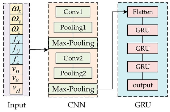 The CNN-GRU neural network model consists of a combination of CNN and GRU [], as shown in Figure 5. Initially, a CNN layer is established to extract spatial features from motion sensor data. Following the CNN layer, a max pooling layer is added, which extracts primary features by selecting the maximum value within each pooling window, thereby reducing the spatial dimensions and size of the input feature map. This operation helps to reduce the number of model parameters and computational complexity, minimize the risk of overfitting, and enhance the model’s computational efficiency. After the CNN module, a GRU layer is connected, using Flatten to spread out the features into a flat array linked to a fully connected layer. The CNN-GRU-assisted prediction model is used to output pseudo GNSS data, compensating for the accuracy of the integrated positioning system during interruptions. This solves the problem of the integrated positioning system degrading to a pure INS during GNSS outages.