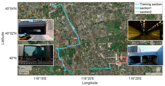 We conducted experiments with frequent and sustained interruptions of GNSS signals to evaluate the performance of the proposed algorithm. The experimental test trajectory is shown in Figure 7, which includes common occlusion environments such as overpasses and tunnels that the vehicle passed through. The total length of the experimental trajectory was 32.96 km. The light blue section, which is 18.99 km long, includes data collected for training the neural network prediction model and determining its parameters. The green trajectory, measuring 7.79 km, was used to assess the algorithm’s performance under conditions of frequent GNSS interruptions. The orange trajectory, extending for 6.18 km, was used to evaluate the algorithm’s performance during sustained GNSS interruptions. To highlight the superiority of the proposed algorithm, we compared three different integrated navigation methods.