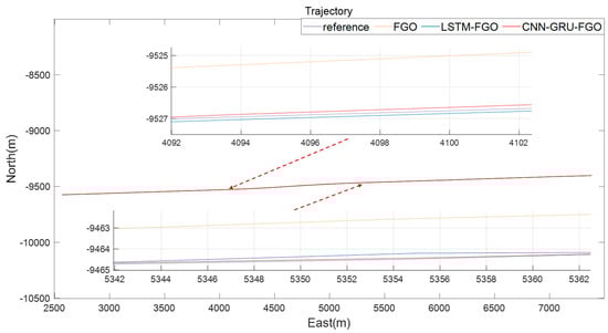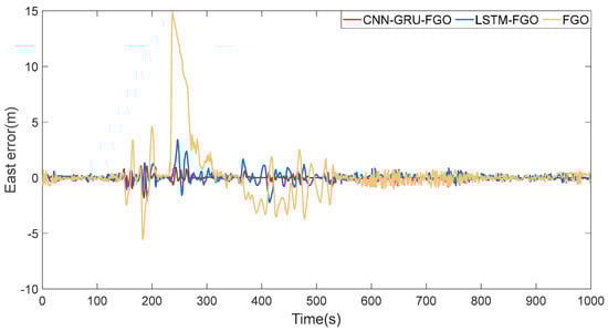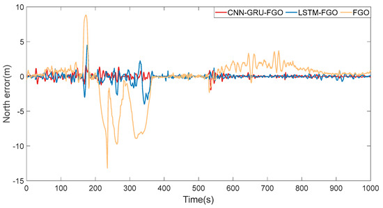 From the solution trajectories of the three algorithms shown in Figure 12, in cases of continuous GNSS interruptions, the trajectory of FGO gradually deviates from the reference trajectory, and this deviation increases over time. According to the eastward error curve in Figure 13 and the northward error curve in Figure 14, we can clearly see that the error of FGO is significant. Although the errors of LSTM-FGO and CNN-GRU-FGO also increase, they are significantly smaller compared to FGO. This significant reduction in error is mainly attributed to the LSTM-FGO and CNN-GRU-FGO algorithms’ ability to more effectively utilize past data to predict GNSS positions, especially in the absence of real-time GNSS data, ensuring the robustness of the integrated navigation.