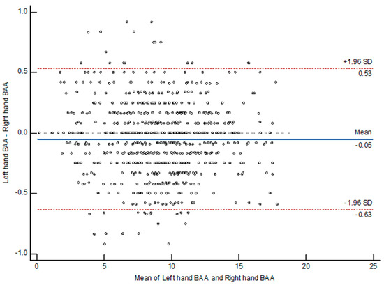 Our study showed an excellent overall correlation of BAA using the model between both hands, refuting the findings of Roche [23]. Considering that approximately 10% of the population is assumed to be left-handed [28], it can be concluded that the dominant hand appears to mature at the same rate as the non-dominant hand, and that the right-hand BAA can be used as a validation tool. Among the total participants, 59 (7.8%) showed an ADBH model score of >0.5 years, with higher MAD values (left: 0.409, right: 0.424) compared to previous studies using the same model (0.39 and 0.37, respectively) [11,24]; their highest values were 1.75 years for the left hand and 1.33 years for the right hand. Although this result does not mean that a higher ADBH model score indicates a measurement error, it could serve as a cue for manual supervision.