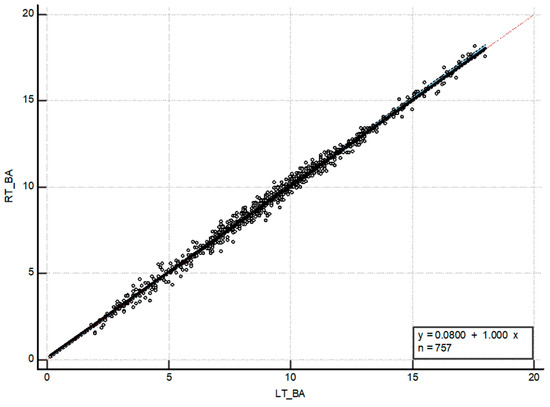 The results of the Bland–Altman analysis, which was used to assess the agreement between each hand’s BAA, are shown in Figure 2. The mean difference between both hands’ BAAs was 0.05 years (95% CI, 0.63–0.53); 4.6% (35/767) of the data were outside the limits of agreement. The Passing–Bablok regression analysis showed that the overall correlation of the BAA between both hands was excellent, having no significant deviation from linearity in this association (p = 0.15) (Figure 3). According to the model, the bone age of the right hand was approximately 1 month more advanced than that of the left. The Pearson’s correlation coefficient was r = 0.995 (p < 0.001) for the BAA between both hands.