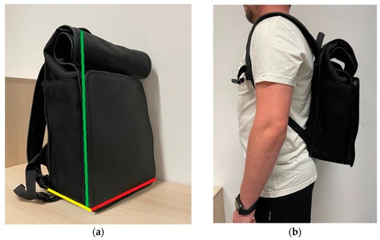 (a) Backpack with marked dimensions. Height, 38 cm (green line); width, 28 cm (red line); depth, 15 cm (yellow line). (b) Adjusting the backpack position to the participant so that the lower edge of the backpack was at the level of the upper part of the sacrum and the backpack fitted tightly to the back.