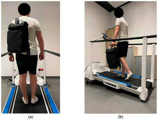 The examined person wore sports clothes and was without shoes [25,26] during gait measurements on the treadmill. Barefoot walking eliminates discrepancies related to different types of footwear and does not require any standardization of shoe parameters. The participant first walked on the treadmill for approximately 5 min to warm up, selecting their preferred comfortable speed for normal walking [21]. Then, they walked for approximately 1 min during each trial to familiarize themselves with the conditions, of which 30 s was recorded [27]. Order of trails: (1) control trial—unloaded walking at preferred speed (no treadmill incline and with +5° incline); (2) backpack walking at preferred speed without treadmill incline (backpack on shoulder, backpack in hand); (3) backpack walking at preferred speed with +5° incline (backpack on shoulder, backpack in hand). There was one trial for each condition, with continuous recording of gait parameters for 30 s. Participants carried the backpack on their preferred side, which was established based on questions about their preference for carrying bags/backpacks during their daily activities (Figure 2).