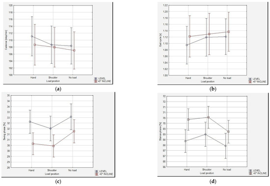 The statistically significant interaction of incline factor and load position was found in the stance phase (F = 4.29, p = 0.02, ηp2 = 0.10), swing phase (F = 4.18, p = 0.02, ηp2 = 0.09), gait cycle (F = 12.67, p < 0.001, ηp2 = 0.24) and cadence (F = 16.88, p < 0.001, ηp2 = 0.30). The interactions are graphically presented in Figure 3.