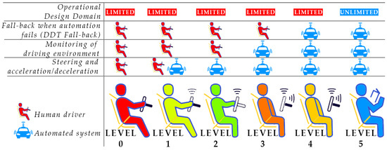 Autonomous vehicles are categorized into different levels of automation, as defined by the Society of Automotive Engineers (SAE) (Figure 1), ranging from level 0 (no automation) to level 5 (full automation) [24]. Higher levels indicate increased system independence and decreased human intervention, primarily driven by advancements in image analysis technology. At level 0, image analysis is not used and the driver is responsible for all aspects of driving. At levels 1 (Driver Assistance) and 2 (Partial Automation), image analysis becomes more critical, managing tasks such as adaptive cruise control, lane-keeping assistance, and semi-automated features like auto-steering and traffic-aware cruise control, respectively. Level 3 (Conditional Automation) marks a significant shift, where vehicles can take full control under certain conditions, heavily relying on high-definition cameras and advanced algorithms for monitoring the environment and detecting objects. At level 4 (High Automation), vehicles operate without human intervention in most scenarios, necessitating robust image analysis systems that integrate visual data with inputs from other sensors such as LiDAR and radar. Finally, level 5 (Full Automation) epitomizes vehicle autonomy, with the vehicle handling all driving aspects in any condition without human oversight, requiring image analysis capabilities surpassing human abilities in interpreting visual information and making instantaneous decisions