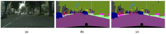 An example of semantic segmentation on the Cityscapes set where: (a) original image; (b) ground truth image; and (c) model prediction result [128].