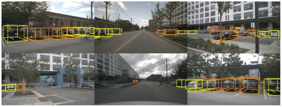 Sample of NuScenes labels. Objects on a single image are colored in orange, while those on two consecutive cameras are shown in yellow [145].