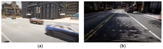 Examples of images from the CARLA simulator: (a) street view and (b) view from the car’s perspective.