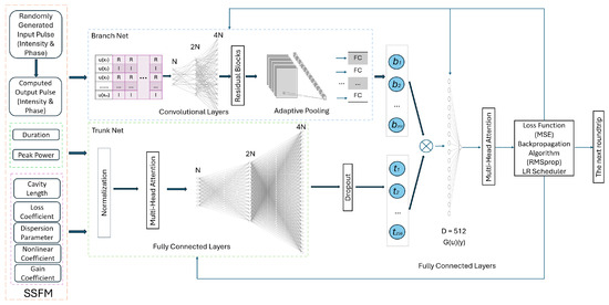 The integration of an attention mechanism [18] aims to enhance the model’s competency in managing complex input–output relationships. By dynamically assigning importance weights to various input features, the attention mechanism effectively captures crucial information within the input signals, thereby improving the model’s learning efficiency and prediction accuracy. In the Branch network, the attention mechanism highlights essential features within the input signals, enhancing the comprehension of multi-level input information. In the Trunk network, it ensures the precise handling of the relationship between output location encoding and the corresponding initial pulse and transmission parameters, bolstering the overall simulation accuracy.