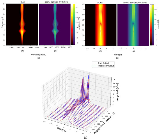 Machine learning has made significant inroads into various disciplines, including optics [1,2]. For instance, machine learning strategies have been employed to design and optimize mode-locked fiber lasers [3], enhance optical supercontinuum sources [4], and predict soliton properties [5]. Compared to numerical methods like the Split-Step Fourier Method (SSFM) [6], machine learning approaches offer several advantages. First, high-precision fiber systems often exhibit rapid changes. Although numerous studies have discussed automatic stability control, the discrepancies between computed and actual values lag behind the rapid changes in fiber systems [7,8]. Second, numerical methods may not account for the various influences affecting lasers in real environments, and the complexity of simulations and calculations increases with system complexity [9]. In contrast, data-driven machine learning methods can model actual optical systems and even predict their future states by inputting the corresponding input–output states [10], a feat that numerical methods like SSFM cannot be achieved.