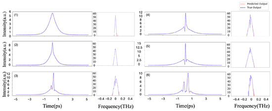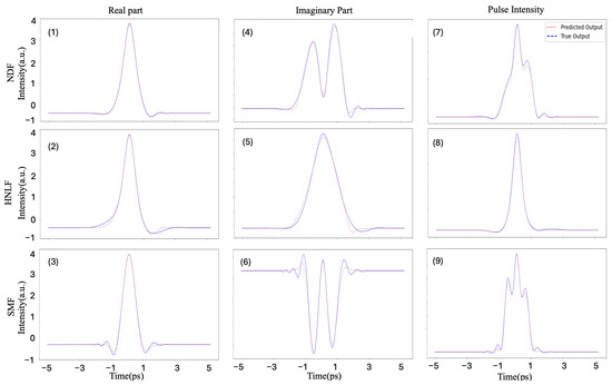 After training, we evaluated the model’s performance by setting the parameter values for different fiber types to their median values and fixing the fiber length at 80 mm to regenerate the test set. The comparison between the predicted pulses and the Split-Step Fourier Method (SSFM)-calculated pulses is presented in Figure 4 and Figure 5, demonstrating the model’s ability to accurately simulate pulse propagation across diverse fiber types with varying characteristics.