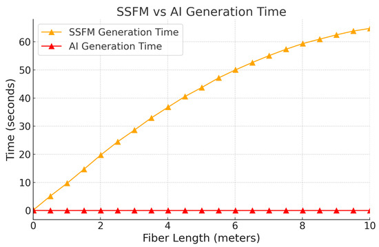 We recorded the generation times as shown in Figure 6, which compares the times required for the Split-Step Fourier Method (SSFM) and DeepONet across different fiber lengths. The step size for SSFM was set to 1 mm. The vertical axis represents generation time (in seconds, on a linear scale), while the horizontal axis represents fiber length. The figure demonstrates that the generation time for SSFM increases exponentially with fiber length, whereas the generation time for DeepONet remains significantly lower and nearly constant at approximately s across different fiber lengths. This indicates that DeepONet is far more efficient than SSFM as the fiber length increases.