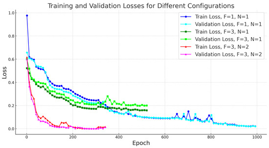 To quantify the superior generalization ability and computational accuracy of our model compared to others, we compiled the loss functions for different configurations during HOS generation, as shown in Figure 7. Here, F represents the number of free fiber parameters. In scenarios where only the fiber length varies (), the root mean square error (RMSE) is 0.01764, the lowest recorded value, indicating high accuracy in pulse prediction throughout the evolution process. We also tested scenarios where pulse width, input peak power, and fiber length varied randomly. When the model width parameter , the accuracy significantly dropped, converging at 0.156. However, increasing the model size to significantly improved the model’s learning ability, achieving a validation loss of 0.0248 within only 320 epochs, demonstrating excellent scalability and performance under complex conditions. The ability to handle three fiber parameter variables simultaneously, with changes in both fiber parameters and propagation distance, represents a broader range of fiber output variability and increased learning difficulty, in which our model performs exceptionally well.