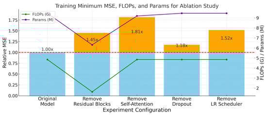 Secondly, the dropout layer and the learning rate scheduler also demonstrate important roles in enhancing the model’s generalization ability and stability, although their impact is not as pronounced as that of the residual blocks and the self-attention mechanism. The MSE increased by 18% when the dropout layer was removed, indicating that dropout contributes to preventing overfitting and maintaining generalization. Dropout achieves this by randomly dropping out certain neurons during training, preventing the model from over-relying on specific pathways, thereby improving its performance on unseen data. Notably, neither the FLOPs nor the model parameter count were affected by the removal of dropout, confirming that its contribution lies primarily in regularization rather than computational efficiency.