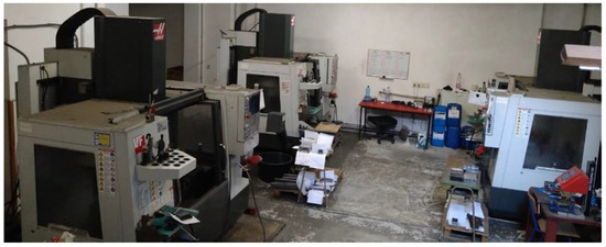 Given the capabilities offered by both programs, a comprehensive model of the working environment was created in the simulation environment of the Dialux Evo software. This layout was then imported into the Relux software environment. Based on both technical drawings and in situ measurements, a detailed model of the working environment was constructed in Dialux. This model includes three CNC machines and auxiliary tables (AT1–AT3) used for auxiliary tasks, storage of tools, or intermediate storage for further production. The analyzed working environment was constructed in accordance with the working procedure of the simulation model [40].