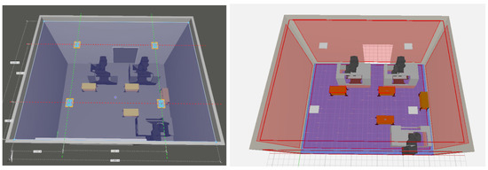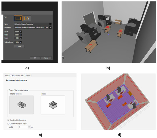 In both software solutions, a virtual working environment of an industrial hall with dimensions (10 × 13 × 8) m was created (Figure 1).