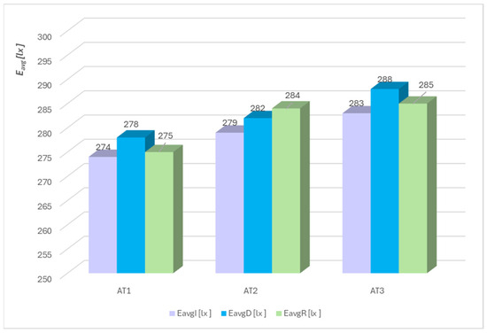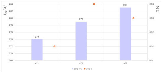 In the created models, the reflectances of objects and materials were set to the same values in both software tools, in accordance with the recommendations established by the ISO/CIE TS 20 012 36 0072 standard [43]. The creation of the lighting system (characteristics of luminaires and their arrangement in the space) was based on the initial in situ measurements. Due to the outdated lighting system, it was not possible to identify precise parameters, and no technical documentation existed. Initial measurements were conducted at three measurement points on the auxiliary tables (designated AT1–AT3). At each measurement point, a series of continuous measurements was performed for 5 min, with data recording intervals of 5 s. Measurements were conducted in accordance with international standards of the International Commission on Illumination using a KIMO LX200 lux meter (Kimo Electronic Pvt Ltd., Mumbai, India) and evaluated with LLX200-specialized software., v1.3.2.0. The following graph (Figure 3) shows the average values of illuminance and uniformity at points AT1, AT2, and AT3—the monitored areas of the production hall. According to current standards [44], the illuminance level for this type of operation should reach at least 300 lx, and up to 500 lx in spaces without natural light. The graph clearly shows that the illuminance levels at the monitored points do not meet these minimum values, necessitating the rationalization of the lighting system. Adjustments based on uniformity values are not needed, as all monitored points showed values above 0.6.