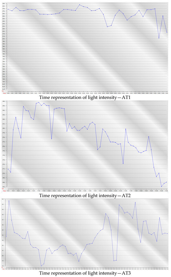 The necessity of rationalizing the lighting system can also be confirmed by the illuminance measurements over time, as shown in Figure 4. These time-dependent measurements revealed significant fluctuations in illuminance over short periods, primarily due to the outdated and poorly maintained lighting system.
