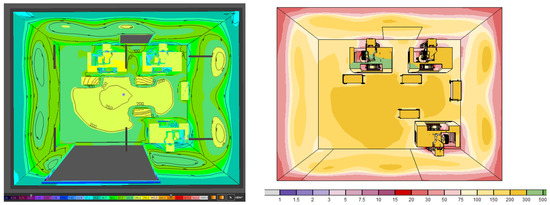 Distribution of isolux in the model solution of the current lighting state in the production hall: Dialux (left) and Relux (right).
