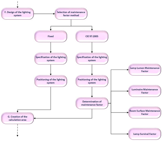 The definition of a new lighting system with the specification of the maintenance factor was carried out in accordance with [40,46], with the sequence [40] extended to address the general determination of the maintenance factor in stage F—Design of the Lighting System. The created extension is presented in the following diagram (Figure 7).