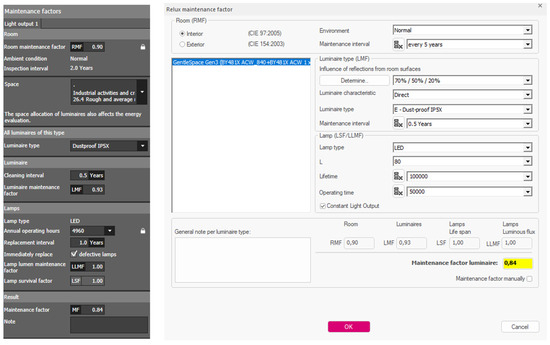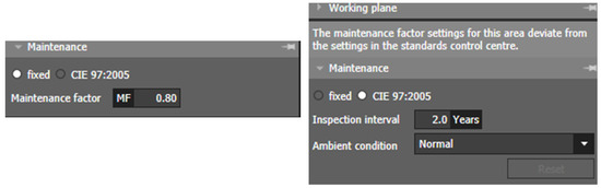 Selection of Maintenance Factor Method—In this part, it is essential to correctly select the method for determining the maintenance factor, as this choice influences the achieved values of the monitored lighting parameters. In simulation tools, the maintenance factor can be considered through two options: Option 1—Fixed Maintenance Factor and Option 2—Determination of Maintenance Factor According to Partial Parameters via CIE Formula (1)
