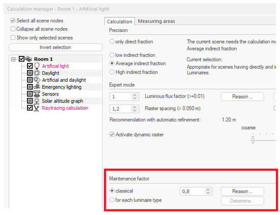 In Relux, the method selection was carried out through the “Calculation Manager” module (Figure 9), where the method for determining the maintenance factor—fixed (Option 1)—is labeled as “classical”, and the method according to CIE 97:2005 (Option 2) is labeled as “for each luminaire type”.