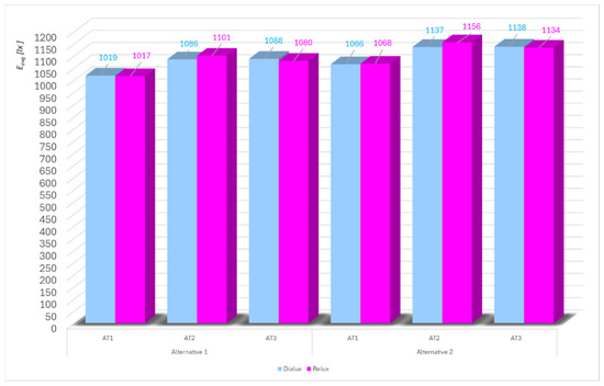 For Alternative 1, the average lighting levels are 1064 lx (Dialux) and 1066 lx (Relux), while for Alternative 2, they are 1113 lx (Dialux) and 1119 lx (Relux). In both cases, a deviation of approximately 5% was observed when using different options for the maintenance factor (fixed and calculated). This indicates a risk of oversizing the lighting system when relying on a pre-set maintenance factor. Consequently, an increase in illuminance values based on an incorrect determination of the maintenance factor could negatively impact energy consumption. Over time, this could lead to unnecessary oversizing, resulting in energy waste.