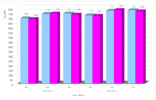In Alternatives 3 and 4, the number of luminaires was reduced, which positively affects energy consumption. However, this leads to higher initial costs associated with redesigning the electrical installation system and the new layout of the lighting system. Despite this, these alternatives also met the normative requirement of a minimum illuminance level of 500 lx (Figure 13).