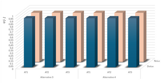 In Alternatives 3 and 4, the uniformity of illumination was also analyzed due to the changes in the number and positions of the luminaires. The data obtained (Figure 14), shown in the following figure, indicate that the uniformity of illumination is the same at all the monitored points, specifically with a value of 0.93. Since the minimum normative requirement for the uniformity of illumination in production areas is set at 0.6 or higher, the positions of the luminaires in the proposed design can be considered suitable.