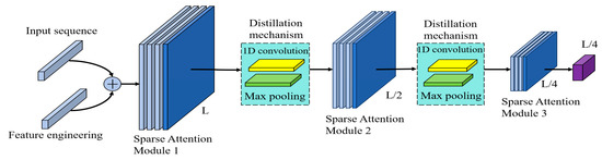 The distillation technique incorporates one-dimensional convolution and max pooling. After the sequence data have been processed by the multi-head sparse attention mechanism, it is fed directly into the distillation layer, which reduces the network parameters and emphasizes important features. This process involves dimensionality reduction and lowering memory consumption, scaling the output dimensional variables to half of their original length and temporal range. This operation is repeated until the final output is achieved, after which the results are passed to the subsequent multi-head attention module for feature exchange. Specifically, the distillation layer utilizes one-dimensional convolution and max pooling to scale down the dimensions, thereby enhancing the model’s robustness and reducing its memory usage. The construction of this process within the encoder is illustrated in Figure 1.