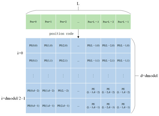 As the later stages require the consideration of sequential spatiotemporal information, the positional and temporal information of input sequences are encoded into vector form. Positional encoding involves generating corresponding position vectors using sine and cosine functions, which are then added to the embedding layer for processing. Let the length of the input sequence be , with the position represented by , the embedding vector dimension as , and the embedding dimension as ; then, the position encoding vector is shown in the following equation. The specific position encoding steps are shown in Figure 2.