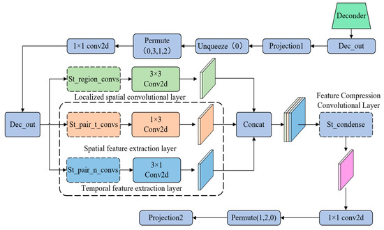 The local spatial convolutional layer (st_region_convs) employs a standard convolutional kernel to capture the spatial information of the domain around each data point. To maintain the consistency of spatial dimensions, the inputs and outputs apply a padding strategy that sets the padding size to (1, 1) to extract local spatial features. Let be the input feature matrix , where , and denote the height, width, and number of channels, respectively, and the convolution kernel using , where the st_region_convs layer is represented as shown in Equation (12). Immediately after that, the spatial feature extraction convolutional layer (st_pair_t_convs) and temporal feature extraction convolutional layer (st_pair_n_convs) are set up to optimize for spatial and temporal dimensions, respectively. The st_pair_t_convs layer uses a convolution kernel of that focuses on capturing the temporal continuum without changing the spatial dimensions and applies a convolution, maintaining a single length in the spatial dimension, helping in understanding the dynamics of the time series in more detail, as shown in Equations (13) and (14). The st_pair_n_convs layer employs a convolution kernel of , aiming to strengthen the spatial relationships within a single time step and enhance the model’s understanding of the spatial dynamics by expanding the spatial context, as shown below.