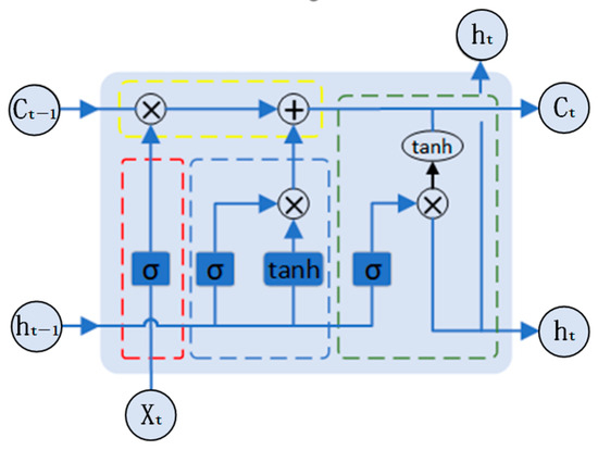 After the decoder output data are processed by the STCN module, this paper introduces the long short-term memory network (LSTM module) to extract the long- and short-term dependencies of the temporal data. The LSTM module can mitigate gradient explosion and vanishing problems when learning long-term dependency terms [47], and outputs to the fully connected layer, obtaining the predicted values through the multilayer perceptual machine. The structure of the LSTM module is shown in Figure 4, and the oblivion gate determines the discarded information from the cell state and reads the previous output and the current input to perform a nonlinear mapping. The output vector is multiplied with the cell state; the input gate determines the new information that is stored in the cell state; the old state is multiplied with the forget gate to determine the discarded information together with the candidate value to realize the cell-state update; and finally, based on the cell state, the result is outputted through the output gate. The overall principle of the work is shown below [48].